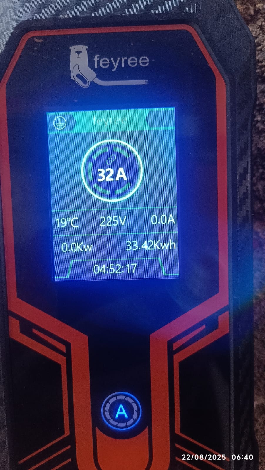 Por fim, hoje pela manha fui olhar o carregador, pois tenho um carregador da freeyre onde no final de cada carregamento ele traz na tela o tempo que ficou carregando e qual foi o consumo em kw. Observe que não foi carregado os 34,92kw que deveria carregar fazendo as contas dos 90% que iria carregar e também não carregou os 31,72kw fazendo as contas com as informações trazidas no painel do carro durante o carregamento, assim como também não durou as 5:12 horas, mais encerrou 20 minutos antes. O Total informado pelo carregador foi de 33,42kw. Temos que pensar que desses 33,42kw informados no carregador temos as perdas por temperatura do cabo, entre outras variaveis que se pesquisarmos no google diz que em walbox e carregadores portateis gira em torno de 10%. Se pegar então so 33,42kw informado no carregador e tirarmos 10% temos um valor aproximado de carregamento de 30,07kw. Pra terminar, eu entendo que mediante tudo que foi apresentado eu tenho algum problema no carregamento ou armazenamento na bateria, o que faz o meu carro ter essa perda de autonomia. Mas eu ja levei em duas concessionaria, acompanhei os mecanicos e em ambas o escanear não encontra nenhum erro, ou seja se não tem erro no escaner não tem o que ser investigado, isso que pra mim que ta sendo dificil, porque eu apresento tudo pra eles, os prints, as contas, eles até concordam, mas se no escaner não apresenta nenhum avaria o que eles vão fazer?