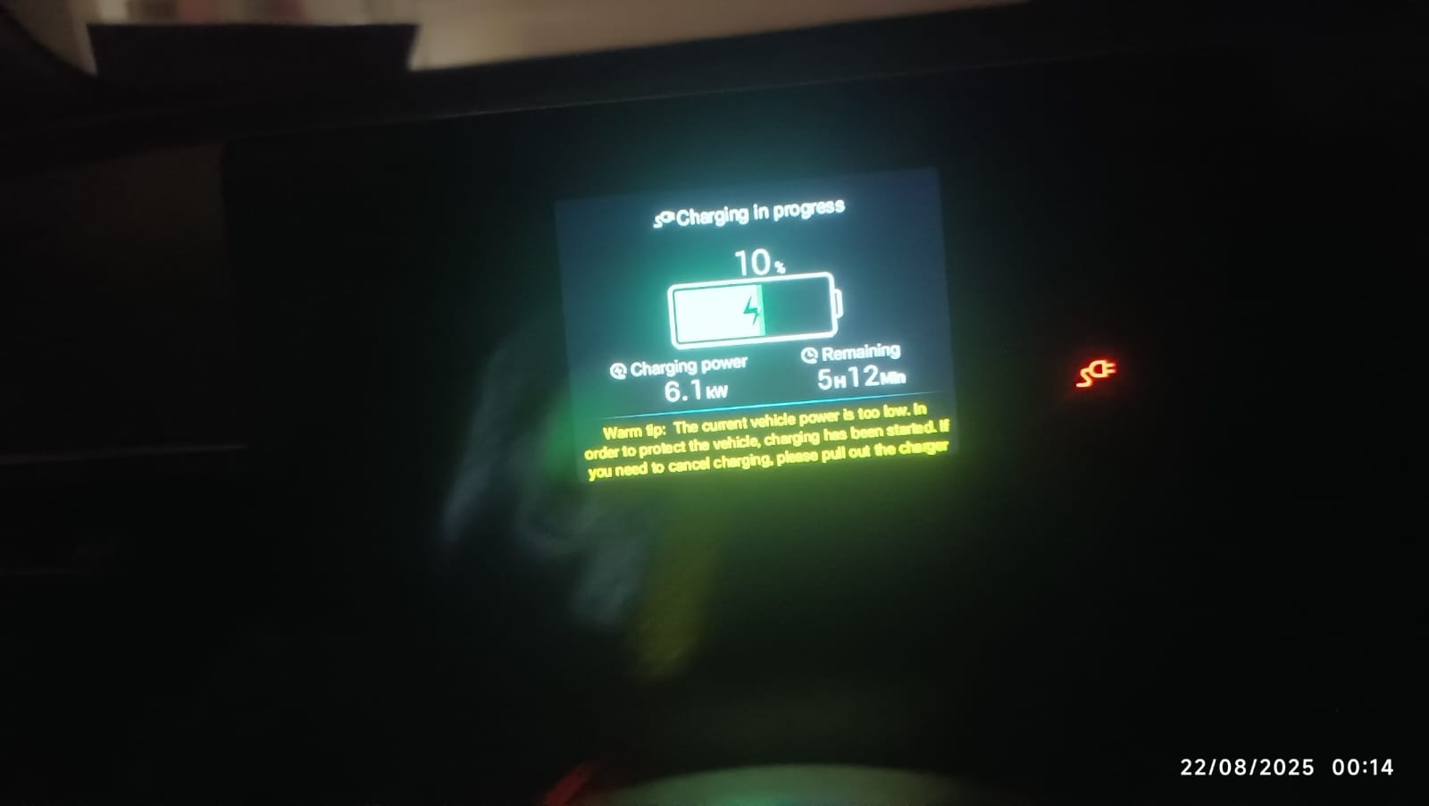 Sei que o certo seria ter colocado o carro pra fazer o carremento em uma baixa amperagem para aproveitar e fazer uma calibração, porém como pode observar a hora, ja era muito tarde e eu precisava do carro hoje as 7 da manha carregado o que seria impossivel fazer isso num periodo muito curto. Observem na foto anexo que o tempo de carregamento para completar os 90% da bateria é de apenas 5 horas e 12 minutos carregando a 6.1 kw o que fazendo uma matematica simples já não bate, porque se preciso carregar 90% da bateria eu preciso então pegar os 38.8 kw dividir por 100% e multiplicar por 90% que o que vai falta para completar, ou seja vou ter que carregar um total de 34,92kw, mais se pegarmos a informação que ta no painel que seria um carregamento a 6.1kw hora e multimplicarmos pelas 5 horas e 12 minutos teremos um total de apenas 31,72kw, muito abaixo dos 34,92kw que deveria entrar na bateria.