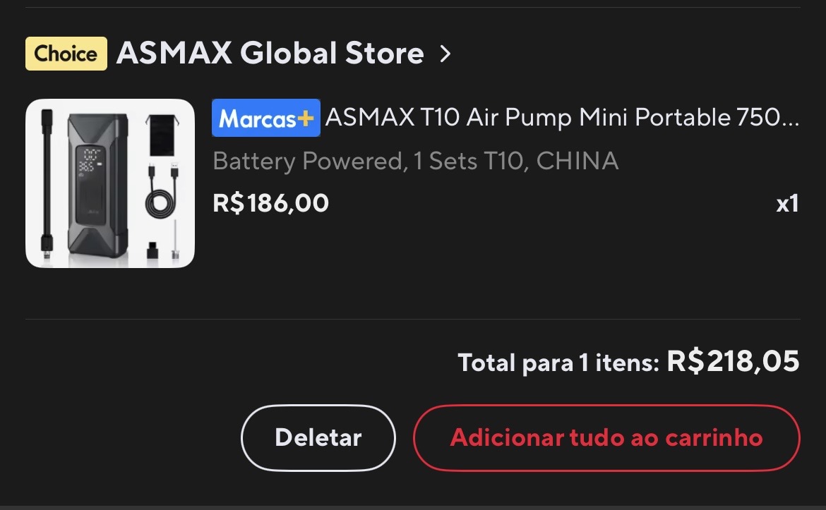 No meu Dolphin MINI, uso essa bomba portátil Asmax T10 que comprei no AliExpress. Vi modelos mais baratos da Baseus e Xiaomi, mas nos comparativos ela sempre se saiu melhor, e acabei comprando. Calibra os pneus rapidinho, e a precisão dela, comparada aos sensores do carro, tem só 0,2 de diferença, deve ser o ar que escapa ao desconectar.