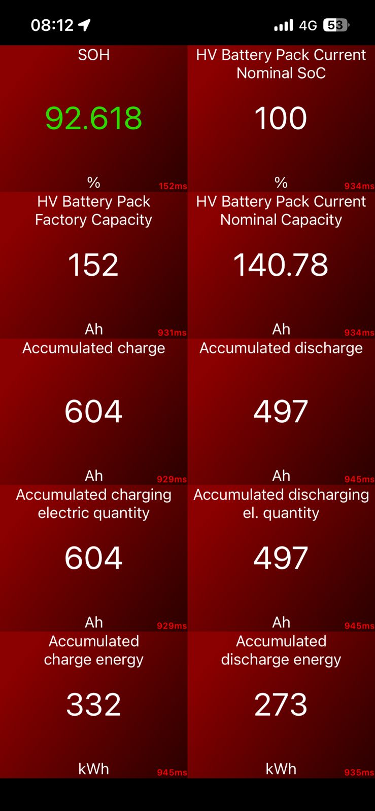 Analisando os dados, quando via ODB o carro tinha 0,1 % de bateria no Electro tinha 2,9. Coloquei pra recarregar, consegui injetar 138 AH dos 150. O Carscanner me mostra a saude em 92% ±, entao, ele calcula a saude com base no que voce consegue carregar na bateria no ultimo processo de carga. Na próxima carga, vou deixar baixar a SOC para 0 no Electro, e vou analisar a voltagem das celulas, se estivem altas, vou deixar baixarem pra menos de 3v (o Lmit minimo é 2,65v) e fazer a recarga e ver quantos AH consigo carregar e assim ver o SOH, provavelmente vai subir.
