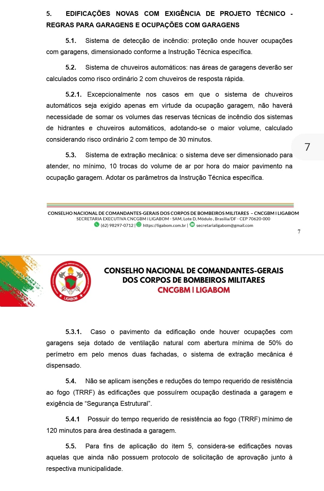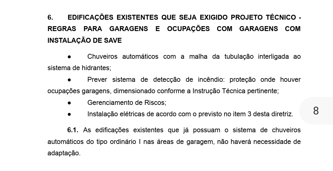 não importa muito, afinal ele dividiu o documento em seções a serem aplicadas. A seção que gerou mais dúvida é a 6 “EDIFICAÇÕES EXISTENTES QUE SEJA EXIGIDO PROJETO TÉCNICO - REGRAS PARA GARAGENS E OCUPAÇÕES COM GARAGENS COM INSTALAÇÃO DE SAVE”, claramente ele cita garagens que seja exigido projeto técnico, ele não pode definir qual garagem precisa de projeto técnico, nesse caso ficou para os CREA, mas já citou que não importa se Garagens ou Garagens com SAVE. Dessa forma não adianta os vizinhos votarem contra nos condomínios, caso seja exigida adequação das garagens existentes será para todas, não importando se tem carregador de VE