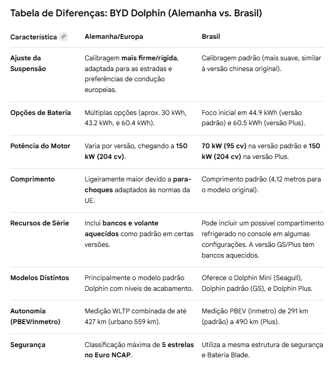 A maior diferença é o preço, sem sombra de dúvidas. Se você considerar o poder de compra do Real em relação ao Euro, e usar o salário mínimo como referência, você precisaria de cerca de 12 meses de salário para comprar um Dolphin na Alemanha. No Brasil? Uns incríveis 100 meses! Basicamente, 10 vezes o custo. É claro, se você apenas converter R$ para Euro, o preço parece comparável, em torno de €18.000 pelo modelo básico.