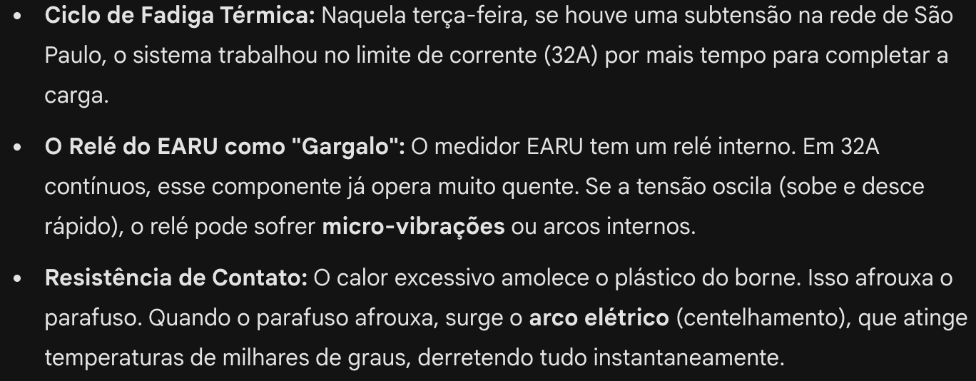 Eu acredito mais na hipótese de falha na conexão ou oxidação na conexão. Esses medidores costumam ter alarme de sobretensão e subtensão, em caso de alarme ele “desarma”. Precisaria ver se estão ativados, configurados apropriadamente. Não tenho certeza do que estou falando, mas se estava carregando em 7kw, o carro não iria “pedir” mais corrente pra compensar a queda de tensão, pois o limite já estaria nos 32A.