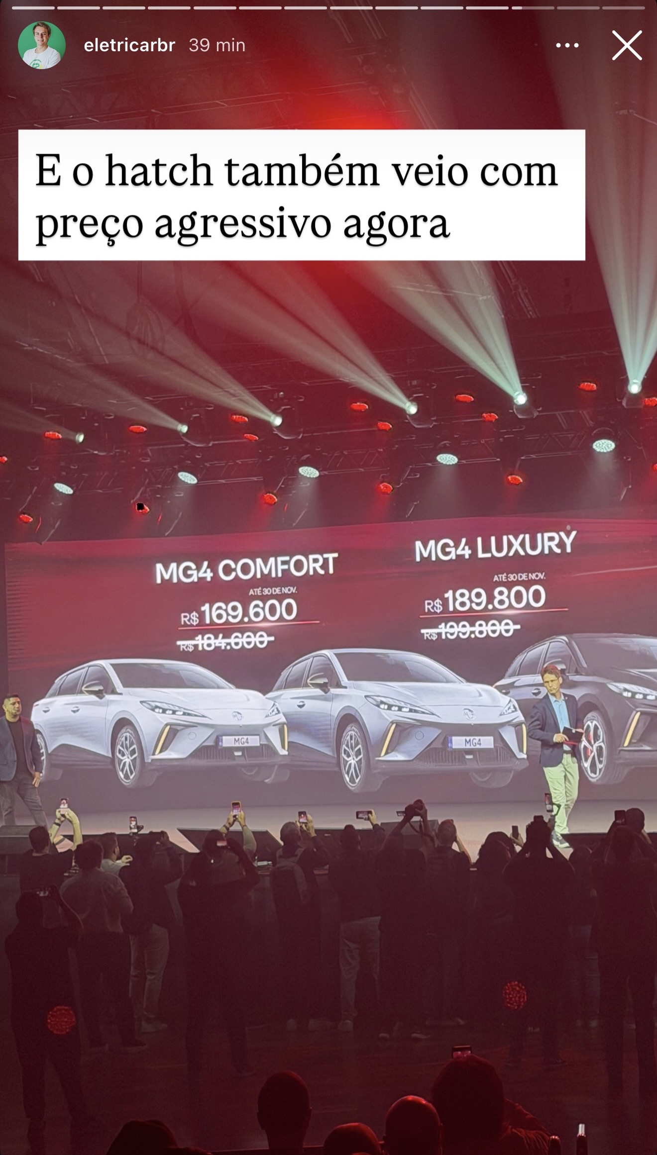Acabei de ver no stories do Mateus da Elétrica Car BR que a MG lançou 2 versões “civis” do MG4, comfort e luxury por R$169k e R$189k respectivamente.