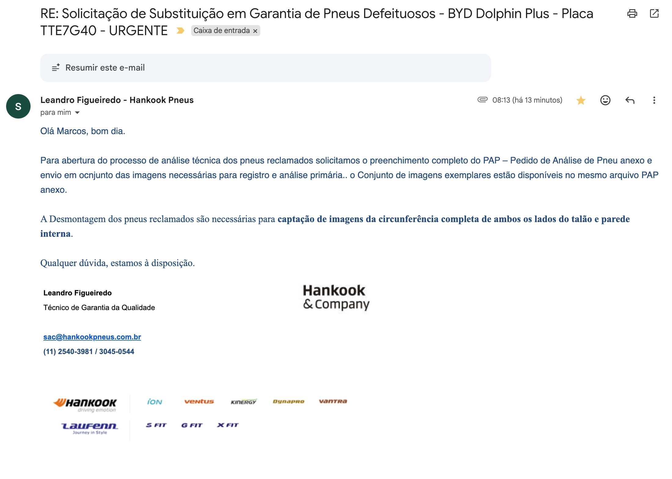 Procurei a garantia da BYD, informaram que é até 10 mil km somente ou 6 meses. Já a garantia da Hankook, de 5 anos contra defeitos de fabricação, responderam (de forma automática), que não é defeito de fabricação rsrssrs (padrão, nunca dão garantia)…