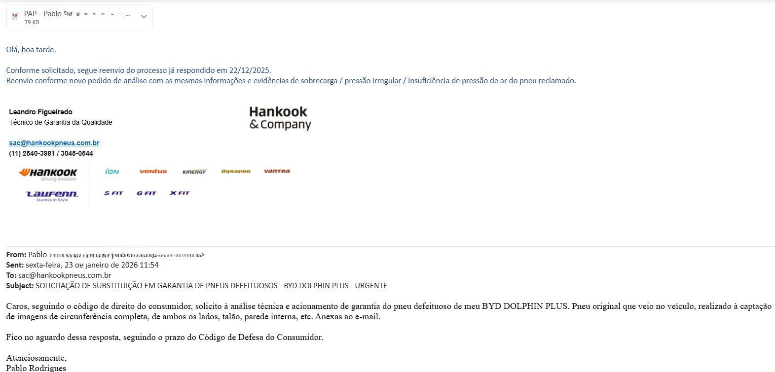 Agora vou orçar pneus novos, trocar e depois vou tentar fazer o procedimento do PAP que foi informado acima e, depois, ajuizar uma ação contra a BYD e talvez contra a Hankook.