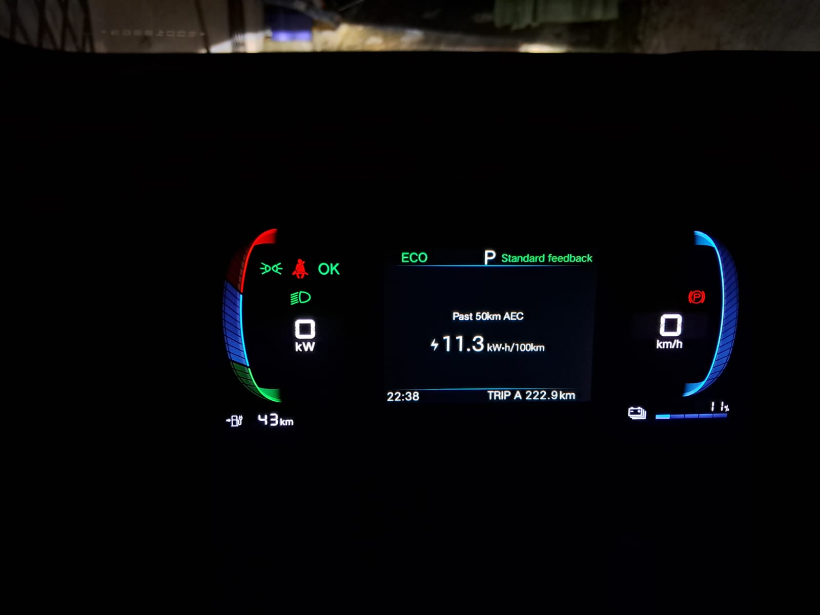 Acho que tem informação misturada aí. Se o marcador mostra 18kw/100km, é esperado que rode uns 200km com uma carga de 38kw mesmo…