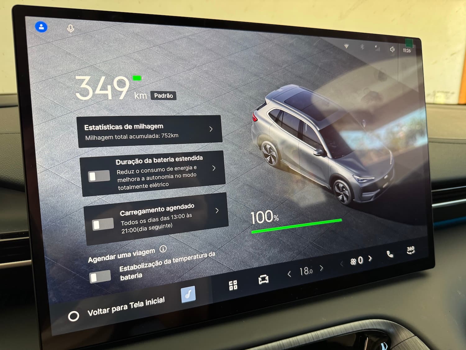 Mas ai o ponto que reparei do EX5 é que ele começa com a estimativa do INMETRO, depois pega o seu consumo de kWh por 100km e vai ajustando a estimativa. Tipo a conta que a gente faz para saber quanto o carro vai andar… mas ele faz automaticamente.