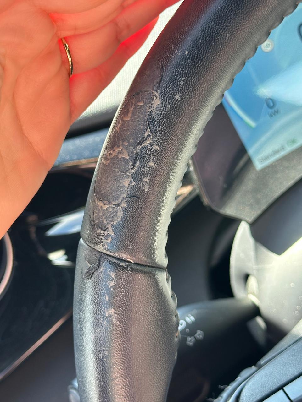 Eu tinha um Citroën C4 Hatch cujo volante também apresentou o mesmo problema, descascou inteiro. E eu acho o acabamento da Citroën sensacional, mas o carro ficava no sol o dia todo, aqui em Recife, e acredito que foi o calor o responsável.